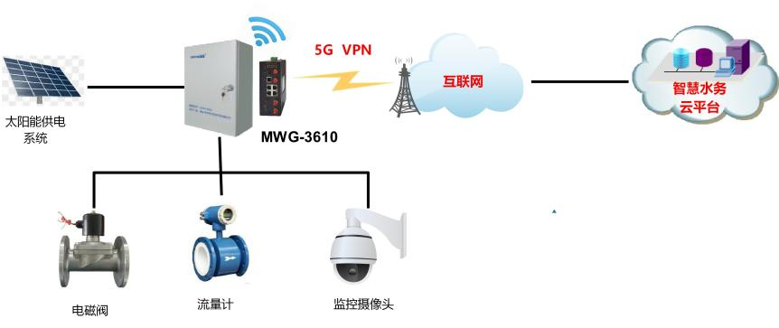 本系統采用5G路由器MWG-3610實現分布點位聯網,可向下兼容電信、聯通、移動4G網絡,支持多種VPN功能,將各個監測站點與監控中心連接組成VPN專用網絡。在現場實施中,MWG-3610可裝入防水型設備箱內,天線則伸出設備箱外,12V的供電標準可適用于太陽能電源供電。可支持WEB、TELNET、SSH遠程配置,實時采集各站點傳感器數據通過5G VPN網絡將管道壓力、流量、閥門開度值、水池水位、水質環境等信息上傳至監控中心。