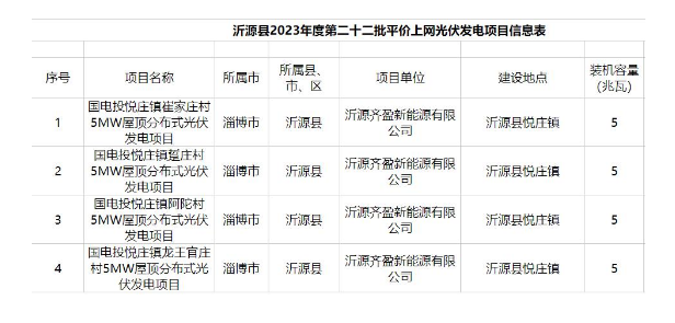 10月7日,山東省沂源縣人民政府公示沂源縣2023年度第二十二批光伏平價上網項目,國電投悅莊鎮崔家莊村5MW屋頂分布式光伏發電項目、國電投悅莊鎮踅莊村5MW屋頂分布式光伏發電項目、國電投悅莊鎮阿陀村5MW屋頂分布式光伏發電項目、國電投悅莊鎮龍王官莊村5MW屋頂分布式光伏發電項目成功上榜,總裝機規模20MW,項目公司均為沂源齊盈新能源有限公司,項目詳情如下: