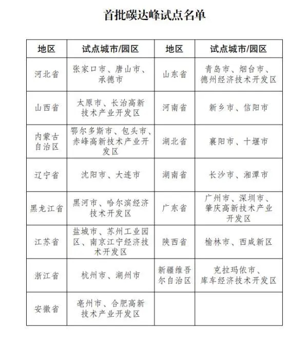 據國家發改委消息,為落實國務院《2030年前碳達峰行動方案》(國發〔2021〕23號)有關部署,按照《國家碳達峰試點建設方案》(發改環資〔2023〕1409號)工作安排,經有關地區城市和園區自愿申報、省級發展改革委推薦、省級人民政府審核、國家發展改革委復核,確定張家口市等25個城市、長治高新技術產業開發區等10個園區為首批碳達峰試點城市和園區,現予公布,并就有關事項通知如下: