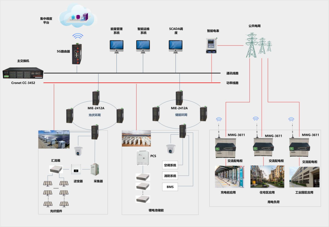 在儲能系統中,通信設備扮演著至關重要的角色。通過合理選擇和配置通信設備,可以確保儲能系統的穩定運行和高效管理。其中光伏環網和儲能環網采用上海兆越工業以太網交換機MIE-2412A組成的MR-ring冗余環網,自愈時間少于20ms,能有效防止某個節點故障造成的網絡癱瘓。主交換機采用三層萬兆高吞吐的工業以太網交換機Cronet CC-3452,最大可支持48個10/100/1000M電口,8個萬兆SFP+擴展槽,接口豐富靈活,可根據儲能項目大小選擇千兆或萬兆帶寬,使系統兼容性更強,大大方便了以后系統的升級擴展。