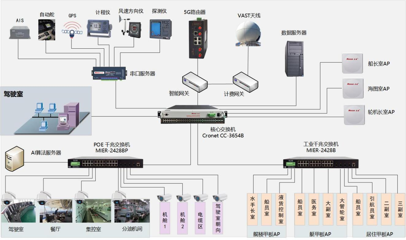 5. 各區域無線接入點(AP)的網絡覆蓋:在船上設置多個 AP,構建全船無線網絡覆蓋,確保船員、以及移動設備(如無人機、AGV等)能夠接入網絡,與岸基、衛星及其他船載系統進行數據交換。