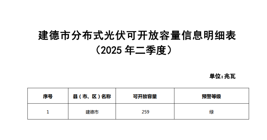 日前,浙江建德市公布二季度分布式光伏可開放容量,根據信息表二季度可開放容量為259MW,預警等級為綠。