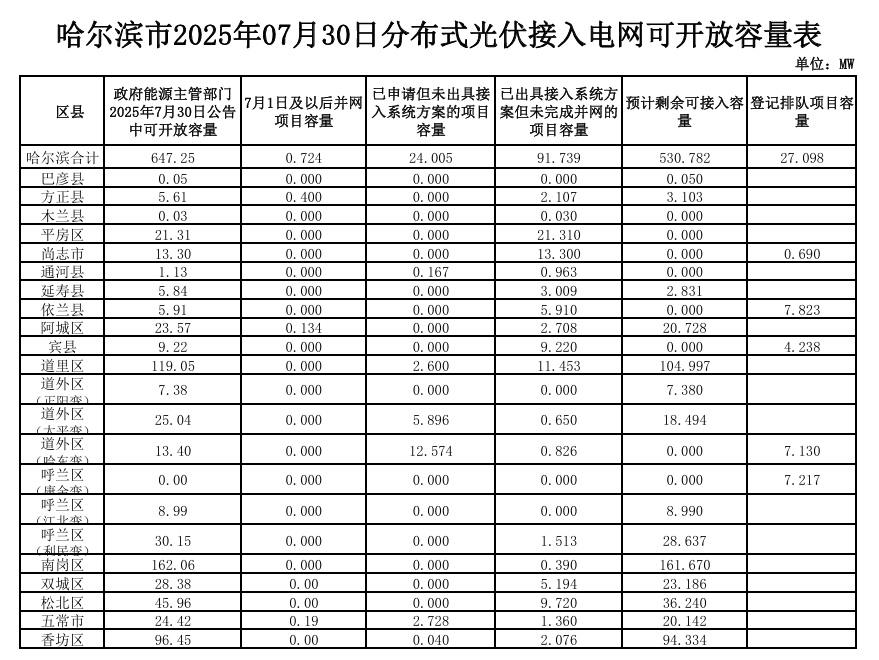 哈爾濱市2025年7月30日分布式光伏接入電網可開放容量表