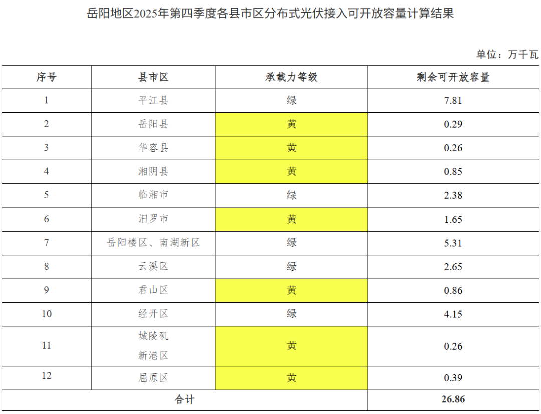 10月20日,湖南岳陽市發改委發布岳陽市2025年第四季度分布式光伏可開發容量,有7個黃色預警區域,5個綠色發展區域,剩余可開放總容量26.86萬千瓦。