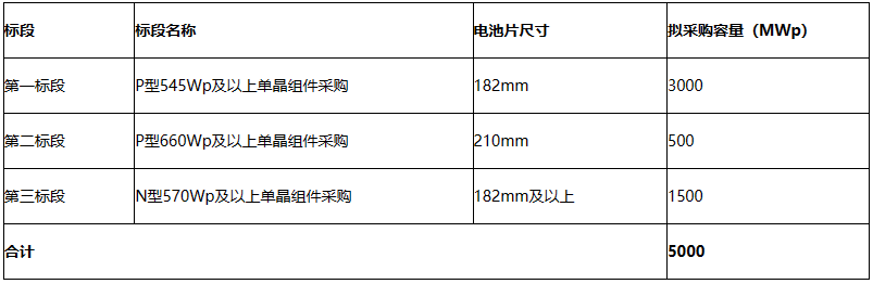 7月10日,三峽集團2023年度光伏組件框架集中采購,預估采購總容量5GW。本項目共設3個標段,第一標段為P型545Wp及以上單晶組件采購;第二標段為P型660Wp及以上單晶組件采購;第三標段為N型570Wp及以上單晶組件采購。