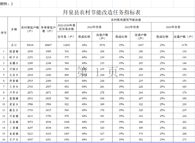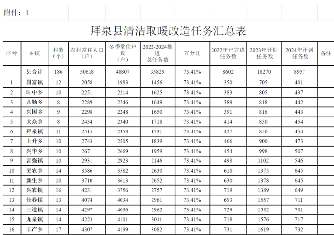 日前,拜泉縣人民政府發布拜泉縣人民政府辦公室關于印發《拜泉縣北方冬季清潔取暖2022-2024年工作實施方案》的通知。根據通知內容顯示,2022年至2024年計劃推進農村清潔取暖改造戶數35829戶。其中,2022年農村清潔取暖改造完成8602戶;2023年計劃完成農村清潔取暖改造18270戶;2024年計劃完成農村清潔取暖改造8957戶。2022年至2024年計劃完成農村節能改造12693戶。2022年完成農村節能改造5076戶,2023年計劃完成農村節能改造4447戶,2024年完成農村節能改造3170戶。改造路線方面,方案指出,利用多元化分散取暖模式推進農村供熱改造。重點解決3.58萬戶農戶清潔取暖。通過推動生物質爐加電鍋爐模式、電鍋爐模式、電熱板模式、生物質模式、集中供熱替代模式以及其他達到國家驗收合格標準的模式解決農村散煤替代。