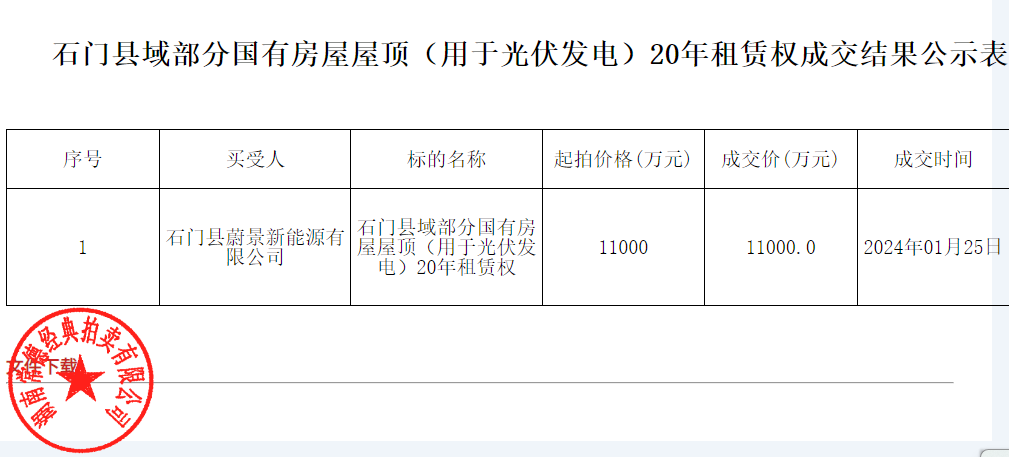 1月29日,常德市公共資源交易中心公布石門縣域部分國有房屋屋頂(用于光伏發電)20年租賃權成交公告。公告顯示,該項目以1.1億元價格順利成交。
