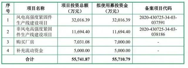 本次IPO,飛沃科技公開發行A股股票1347萬股,發行價格72.5元/股,募集資金總額約為9.77億元,擬用于風電高強度緊固件生產線建設項目、非風電高強度緊固件生產線建設項目、購買廠房、補充流動資金等。