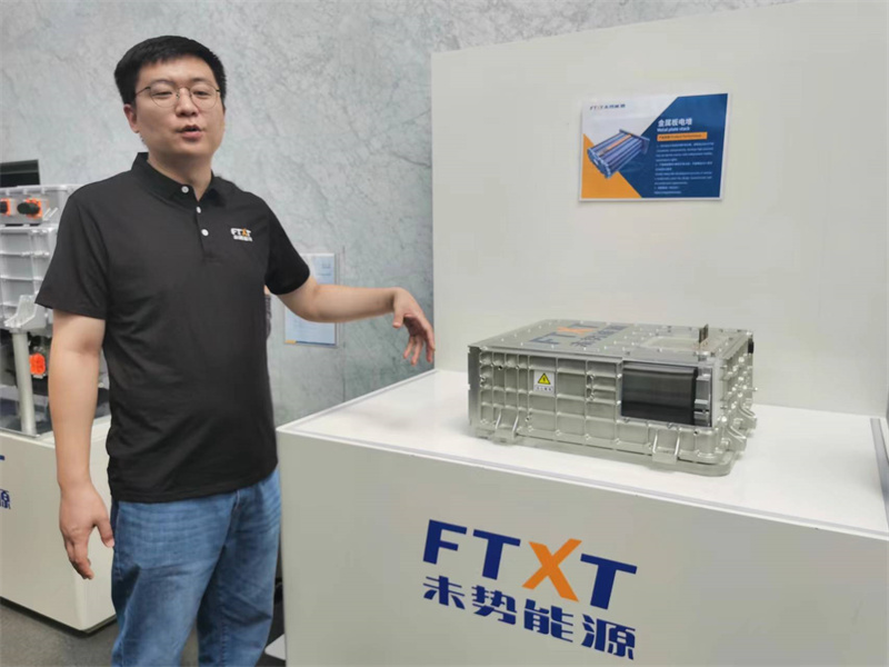 保定未勢能源產業研究院負責人阮藝亮介紹該公司自主研發的電堆。河北日報記者梁韶輝攝