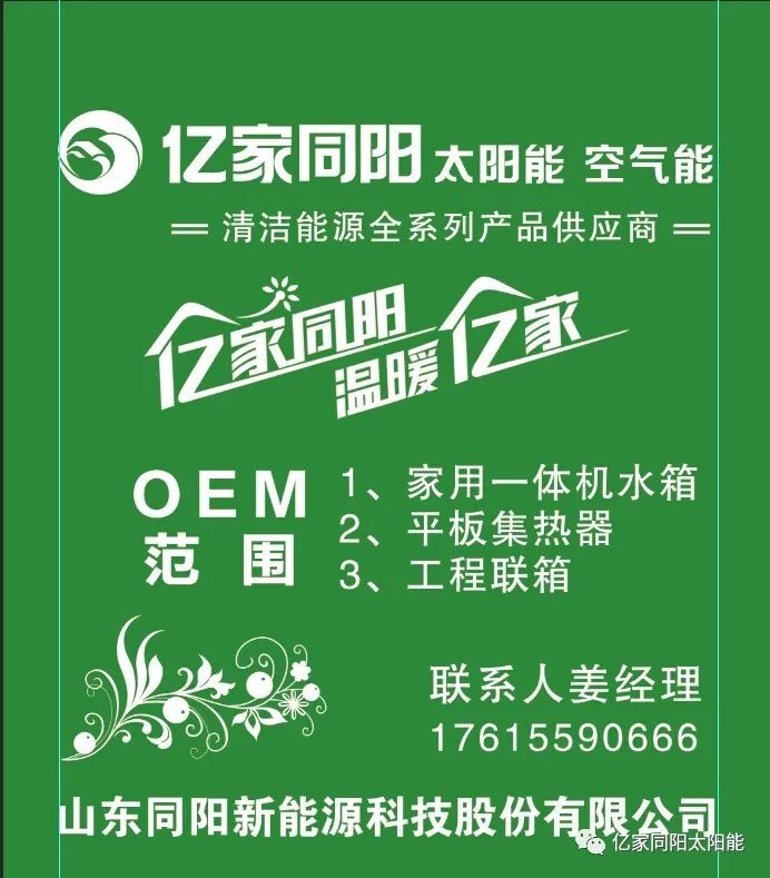 億家同陽致力于太陽能綜合開發應用,具有完善的光熱產品生產體系,產品涵蓋陽臺壁掛太陽能熱水器、家用一體機太陽能、太陽能工程聯箱、太陽能+、承壓保溫水箱、空氣能、空氣源熱泵熱風機等產品,并提供控制柜、循環泵、增壓泵、電加熱等集熱工程配套產品,以及對外承接OEM加工及各類太陽能熱水工程的設計、施工、維護、售后等服務。提供太陽能智能熱水系統、“太陽能 +”智能采暖系統以及與太陽能相關的系統解決方案和空氣源熱泵采暖系統,公司產品廣泛應用于住宅樓、學校、賓館、泳池、醫院等等!!!