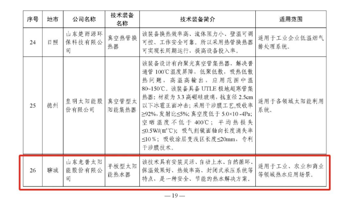 龍普股份憑借平板型集熱器成功入選《山東省工業領域先進節水節能環保技術裝備推廣目錄》